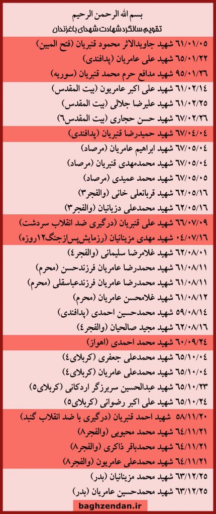 بسیاری از جوانان محله باغزندان در دوران دفاع مقدس راهی جبهه ها شدند.