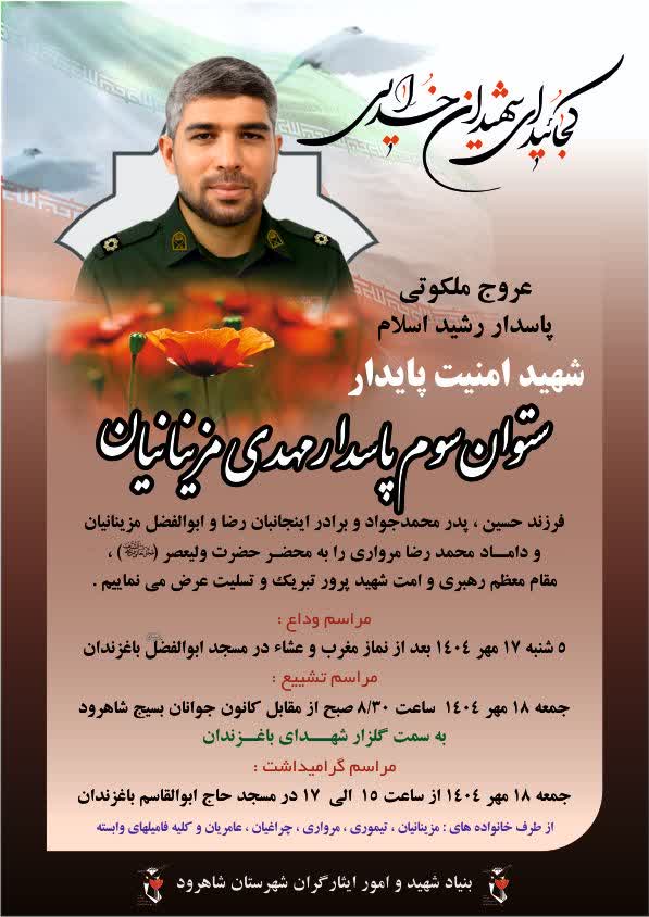 شهادت مهدی مزینانیان، پاسدار رشید تیپ ۱۲ قائم (عج) در مأموریت رزمی پاسخ دهید پاسدار رشید اسلام «مهدی مزینانیان» در حین برگزاری رزمایش سپاه در منطقه عملیاتی گرمسار در تاریخ ۱۶ مهر ۱۴۰۴ به شهادت رسید.